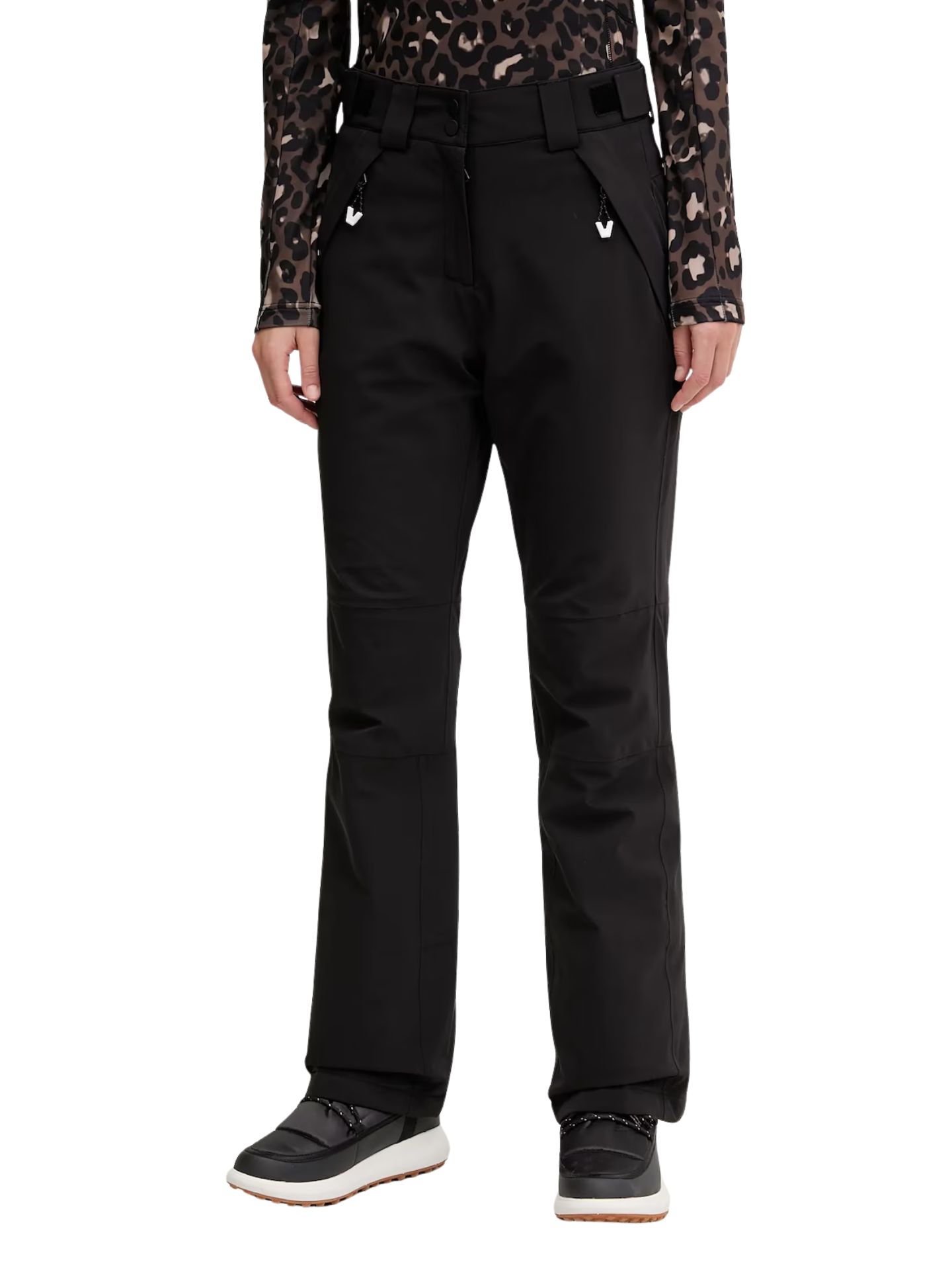 Wewnętrzne fartuchy przeciwśnieżne oraz otwierane doły nogawek dopasowują się do butów narciarskich.